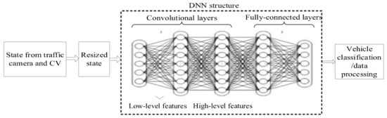 Although traditional reinforcement learning shows better performance in simple models, such as piecewise constant table and linear regression, its scalability and optimality do not seem to be good in reality. In recent years, combining deep neural networks (DNN) with reinforcement learning has become an effective way to improve the performance of reinforcement learning in complex problems [79]. Today’s data is very rich. First of all, it is feasible to use DNN to extract useful feature information from the original traffic information, transform the problem into a reinforcement learning problem, and then use reinforcement learning to learn the optimal traffic signal strategy [80]. Figure 7 shows the structure of a common deep neural network, which consists of three convolutional layers and two fully connected layers. The first two convolutional layers are used to extract low-level features, and the last convolutional layers are used to extract high-level features. Finally, through two fully connected layers, the classification of vehicles and date processing can be achieved. Because DNN can extract information useful for signal control from massive state data, combined with reinforcement learning, it can adapt to current developments more effectively than simple reinforcement learning. This section focuses on deep reinforcement learning (DRL).
