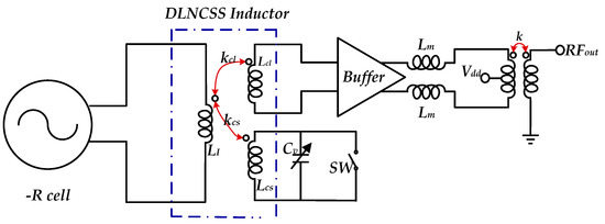 The working frequency of the proposed VCO in this paper was above 100 GHz, and the parasitic resistance of Rp, Rcl, and Rcs was only about a few ohms. , and are approximate to zero. Therefore, we could draw that the effective inductance (Len) and the effective resistance (Ren) of the DLNCSS inductor can be expressed in Equations (8a) and (8b) when the switch turns on.