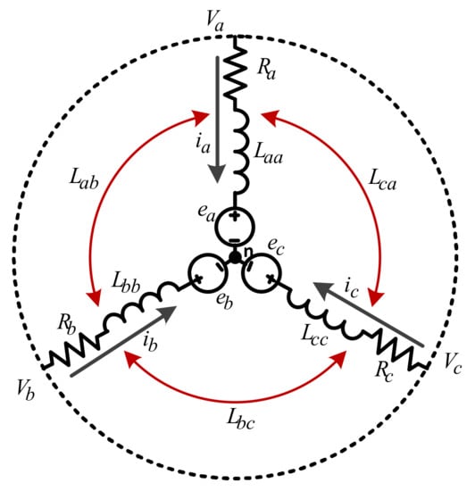 where Van, Vbn and Vcn are three-phase voltages; ia, ib, and ic are three-phase currents; Ra, Rb and Rc represent the phase resistance for each phase; Laa, Lbb, Lcc and Lab, Lbc, Lca, Lac, Lba and Lcb denote the self-inductance for each phase and the mutual inductance between each of the two phases, respectively; ea, eb and ec are the ideal three-phase BEMF. Considering a three-phase balanced system as the sum of three-phase currents equal to zero are satisfied , the stator voltages in Equation (1) can be rearranged into the matrix form as Equation (2):