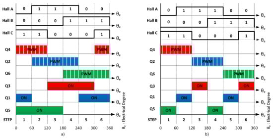 As mentioned in the Introduction, both the 120-degree and 180-degree conduction modes have the same three-phase inverter configuration, as shown in Figure 2. The two conduction modes were implemented by a soft-chopping technique in which the upper-side power transistors Q1, Q3 and Q5 were used to switch on or off, while the lower-side power transistors Q2, Q4 and Q6 were employed to send PWM signals. Each control mode was divided into six intervals for a 360-degree electrical cycle.