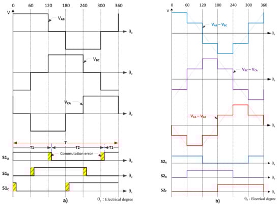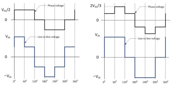 For the 120-degree technique, in this case, the current flowed through the two phases A and B from the positive end to the negative end of the DC bus while the remaining phase C was floated, as shown in Figure 4a. In this switching scheme, each phase per arm was switched on for 120 electrical degrees and switched off for 60 electrical degrees. The next switching state for phase B was that the power transistor Q5 was switched on for the next 60 electrical degrees. The phase voltage in this mode is [20], and its output voltage waveforms, the phase and L2L voltages, are shown in Figure 5a.