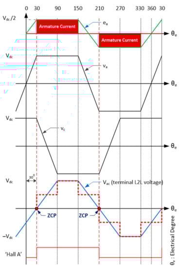 As mentioned in Section 2.1, for the dynamic model of the BLDC motor, the L2L voltages can be expressed as Equation (3) in which their average L2L voltages are used to obtain the SCSs. The sensorless commutation algorithm is described in [15]. The relationship between the ZCPs of the ideal BEMF, L2L voltages, the commutation points and the square-wave L2L output inverter for the 120-degree conduction mode is illustrated in Figure 7. It can be seen that the ZCP of the L2L average terminal voltage lags by 30 electrical degrees compared to that of the phase BEMF or the terminal phase voltage. The commutation points occurred at the same time of the L2L voltage ZCPs. This means that the ZCPs of the L2L voltage were in phase with the ideal commutation points. The average L2L voltage can be expressed as Equations (6) and (7) [15]