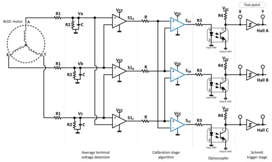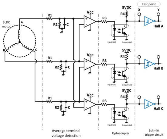 Consequently, the Hall sensorless signals based on the L2L average terminal voltage were implemented in this paper, as shown in Figure 8 [10,15]. The commutation signals were directly extracted from the three terminal voltages, VA, VB and VC, and passed through a comparator. In order to eliminate the noise at the terminal voltages, low-pass-filters (LPFs) were used. The LPFs’ outputs, which were adopted from the three terminal voltages, were connected to the non-inverting pin of the comparators. The inverting pins of the comparators were linked suitably to any remainder terminal voltages to detect the ZCP of the average L2L voltages.