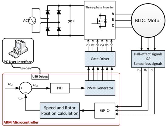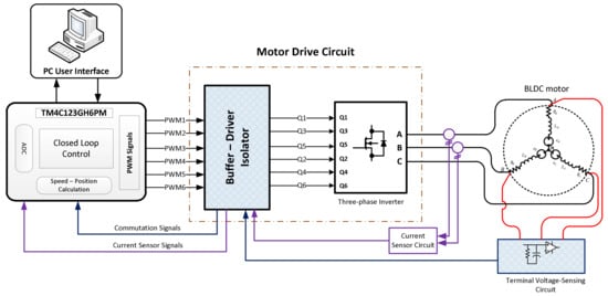 Block diagram of the system hardware architecture for the sensorless BLDC motor drive.