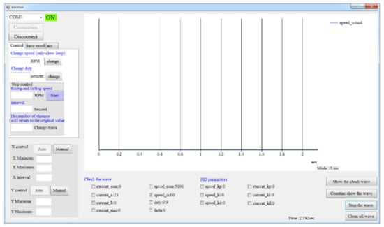 The system software was developed under the Cortex M4 development environment and written in C language. The firmware of the motor drive was programmed based on the Keil integrated development environment tool developed by the Keil company. The firmware contained modules including sensorless starting open-loops, PWM generation, rotor position calculation, motor current measurement and speed calculation. In addition, a graphical user interface (GUI) was also designed using the Microsoft Visual Studio 2017 C# (Microsoft, Redmond, WA, USA) development platform, as shown in Figure 16. The GUI was used to set the command and monitor data such as motor speed, currents, duty cycle and PID parameters. These data can also be stored in the PC in the Excel format.