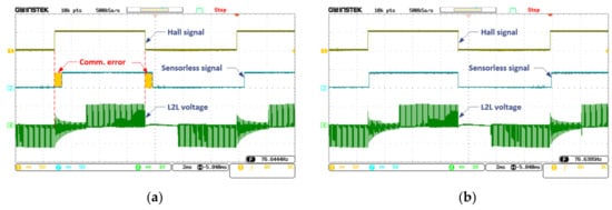 In order to verify the proposed sensorless circuit, in the first test, the SCSs’ experimental results with and without the proposed circuit were performed to compare with the theoretical analysis. Figure 21 shows the Hall signal and SCS of phase A, and the terminal L2L voltage was measured with and without employing the proposed sensorless circuit. It can be seen that both the rising edge and the falling edge of the commutation signal could be transited earlier instead of retarding by about 15 electrical degrees, as shown in Figure 21a. Figure 21b indicates the improved signal of SCS after applying the proposed sensorless circuit. These results are suited to theoretical analysis. It was noticed that the SCS passed through a buffer to get sharp-edge transitions for easy monitoring purposes.