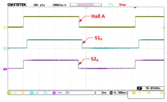 Furthermore, Figure 22 demonstrates the comparison between the Hall signal and SCSs at test points S1A and S2A implemented with and without the proposed circuit as depicted in Figure 12. It can be seen that the commutation signal from the proposed sensorless algorithm was correct.