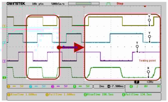 The system’s stability and performance were affected by the qualities of the SCSs, which were related to the rising edge and falling edge of the signals. In the second test, in order to improve these factors, the Schmitt trigger circuit was adopted for the designed sensorless circuit. Figure 23 demonstrates the SCSs measured with and without the inclusion of Schmitt trigger circuits. Ch1, Ch2 and Ch3 indicate excellent SCSs obtained by including the Schmitt trigger action according to phase A, phase B and phase C, respectively. Ch4’s SCS was extracted from phase A which was not implemented by employing the Schmitt trigger operation. It can be seen that the signals with Schmitt trigger action had a sharp shape on both edges and a rising time of 1.68 μs and falling time of 1.6 μs, respectively. On the contrary, without employing the Schmitt trigger circuit, the rising time and falling time were 196.5 μs and 134.5 μs, respectively. Moreover, the Hall sensorless signals that were not reshaped by the Schmitt trigger action may have caused an unstable operation for the microcontroller to generate improper PWM signals for switching.