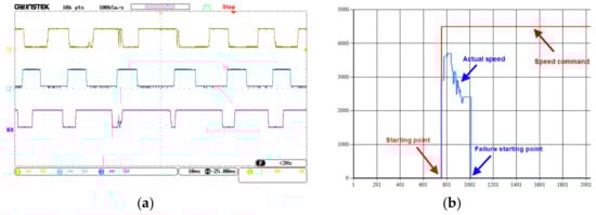 In order to verify the realization of the Schmitt trigger circuit, Figure 24 shows the results of the SCSs and the failure of motor starting without the Schmitt trigger. Figure 24b shows that the actual speed significantly fluctuated in the interval time between seconds 801 and 1001. In this case, the motor starting failure was caused by unstable SCSs, as shown in Figure 24a. It can be seen that the unstable SCSs were caused by noise at the terminal voltages of the motor during the starting procedure, which operated with the LPFs’ cutoff frequency of 1.5931 kHz, while the opposite results were achieved when the Schmitt trigger was included, as shown in Figure 23. However, the motor starting was successful at the cutoff frequency of 35.4543 Hz without the Schmitt trigger. Therefore, the design of LPFs should be carefully considered for certain applications. This finding may be useful for researchers who are considering whether or not to implement a Schmitt trigger circuit for their sensorless motor design. Summaries of some cases with different cutoff frequencies which were studied with and without a Schmitt trigger circuit are shown in Table 4.