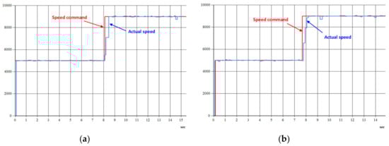 In order to distinguish the performance of speed response with Hall-effect position sensors from that without Hall-effect sensors, Figure 25 demonstrates the profile of the speed step response from 5000 rpm up to 9000 rpm, correspondingly, for the two cases. The solid straight line represents the speed command and the fluctuation line represents the real-time speed for each both figure. The time at which the actual speed reached the command speed was about 0.4 s for the two cases. This indicates that the sensorless position control addressed in this paper could replace the Hall-effect position sensor in the design of power tools’ BLDC motor drives.