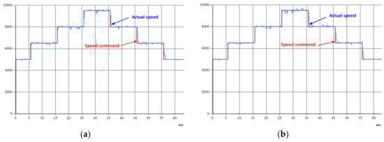 Moreover, to verify the speed response of the designed system with a sensorless position control, in which the speed response profiles are the same for stepping-up and stepping-down, it was tested with different speeds of 5000 rpm, 6500 rpm, 8000 rpm and 9500 rpm. The results were compared with those of the Hall-effect position control. Figure 26 shows the speed responses for both cases with and without using Hall-effect position sensors, respectively. The interval time was set as 10 s. From the observation of both figures, it can be found that actual speeds could catch up with speed commands and remain stable in the operation range. This inherently indicates that the sensorless position control proposed in this paper is feasible and of fidelity. However, there was a fluctuation of actual speed at high speed, and this is a challenge for the 180-degree conduction mode [17]. This is also a drawback of conventional PID control. Therefore, an intelligent PID should be employed in this case.
