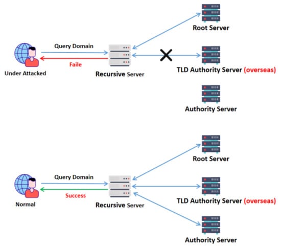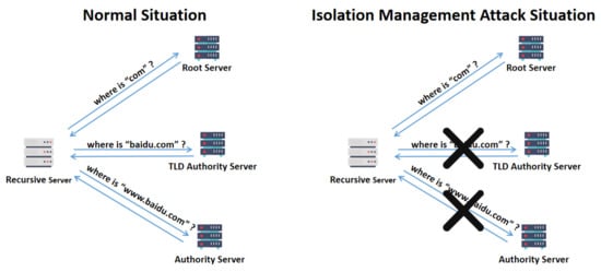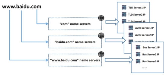 What is the key problem for users who cannot complete a DNS resolution? Resolving a domain name depends on multilevel domain name servers, as shown in Figure 3. A low-level domain name resolution relies on results of high-level domain resolution—for example, the resolution of “www.baidu.com” relies on the resolution results of “.com” and “baidu.com” in sequence. If a user cannot access any domain name servers that manage the zone of “com”, then they are not able to know the IP address of the name servers that manage the zone of “baidu.com”. Therefore, the key problem for users who cannot complete a DNS resolution is that during the recursive resolution, some level of domain name resolution fails. This situation can easily occur under an isolated attack, because the name server can be isolated outside the scope of isolation. We mark the domain name as OSD when it fails to resolve due to the isolation of the domain name server.