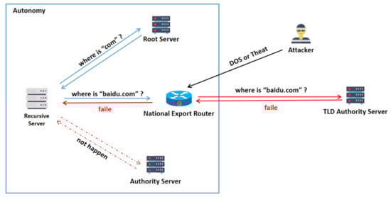 Users basically rely on the DNS when they use Internet services. The stability of DNS services is very important to the availability of a country’s network. If a country’s DNS service fails on a large scale, the profit of Internet users and service providers is ultimately affected. Is it possible to achieve that by exploiting DNS design flaws? The design of the DNS is centralized, which means that some countries cannot fundamentally guarantee the stability of DNS domestically. In Figure 2, we assume that an attacker launches an attack on a country’s network outside the border. A typical attacker can have the following attack capabilities: