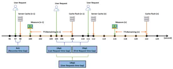 In order to know the time interval of user requests, however, there is a key time interval that we cannot measure directly. For convenience, the last request time gap (LRqG), which is the time gap between the time point of the last user request before a cache flushing and the time point of this cache flushing, is denoted by LRqG, and the first request time gap (FRqG), which is the time gap between the time point of the first user request after a cache flushing and the time point of this cache flushing, is denoted by FRqG. In fact, the data we ultimately want to know are the user request time gap (URqG), which is the time interval between two sequential user requests, i.e., the sum of the LRqG and an FRqG, as shown in Formula (1). In the following section, we introduce a URqG estimation method which is based on the estimation of the LRqG.