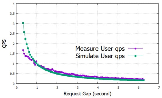 During the simulation, we obtain the cache status from the recursive server by continuously calling the measurement method module. From the data in Figure 6, we find that when the simulated request gap is lower, and the measured user QPS is much lower than the ideal QPS; this is mainly due to the fact that the corresponding data of BIND9 re rounded down, especially in the high- frequency scene, and thus, many calculated values of FRqG are less than zero and must be discarded. When the calculated FRqG is less than zero because of the existence of the rounded error, the estimated LRqG error must be very large, and thus, the measured values are in fact meaningless. When the URqG is around 1 s, we find that its accuracy is relatively high. This is because the error brought by rounded precision is exactly ±1 s. When we configure the simulated request gap to be near 1 s, which is equal to the absolute value of the error, the measured URqG is not much different from the ideal URqG. This means that simulated request gap should not be too small, i.e., simulated QPS should not be too high.
