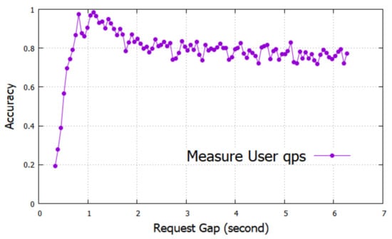 With the continuous adjustment of the experimental configuration, the simulated request gap keeps increasing (i.e., the simulated QPS keeps decreasing). When the simulated request gap is set to be greater than 2 s, the accuracy is stable around 0.8, as shown in Figure 7.