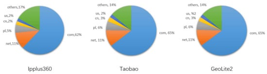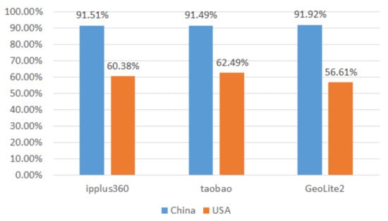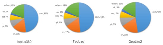 By comparing the differences of various geographic information databases [28], we chose three geographic information databases obtained on ipplus360 [29], Taobao [30], and GeoLite2 [31] for the experiment. In the GeoLite2 platform, we used Lite2-Country_20200421, a database with relatively insufficient data volume; therefore, the results had some deviations, but we found that this has little effect on the results.