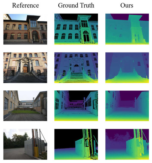 Figure 5 shows the qualitative comparison of DeMoN, COLMAP, DeepMVS, MVSNet, DPSNet and our proposed method. We can see that because DeMoN uses a fixed image resolution for training, the correct scaling factor cannot be obtained when testing with the ETH3D dataset, resulting in inaccurate final results. While COLMAP has improved over DeMoN in the scaling factor of images, the final estimation results are still very noisy. DPSNet and MVSNet are not very accurate in depth estimation of the scene, and there is noise in the results of MVSNet, which are not very smooth. Compared with the above methods, the results of DeepMVS show more detailed disparity information and are smoother. However, in some irregular areas, such as the sky and areas with thin structures, such as branches and complex structures of the wall, DeepMVS shows poor results. However, these problems are all addressed well in our proposed algorithm. It is noteworthy that the depths of the glass regions are incorrectly estimated in the ground truth data.