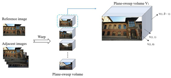 For calculating the plane-sweep volume, we set a disparity parameter and a disparity level of the scene. The disparity level, 0 × denotes the minimum disparity, and × denotes the maximum disparity. The parameter changes with the disparity level. The more the disparity levels, the smaller is the and vice versa. For each disparity level, an adjacent image is warped to the reference image to form a layer in the volume. In principle, the warped image closely aligns with the reference image. After finishing the above steps for all the adjacent images, the plane-sweep volume can be calculated. We define the plane-sweep volume as V = { ∣ n ∈ {1, 2, …, N} ∩ n ≠ R, d ∈ {0, 1, …, 1}}, represents a single patch of the nth adjacent image and the dth disparity layer (See Figure 2). During training, we set the maximum number of levels of disparity to 100 to prevent the GPU memory to overflow.