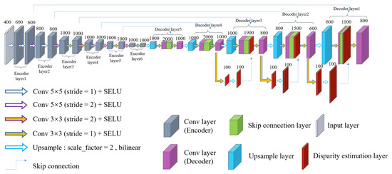 We use these 400-channel patch matching features as input to our proposed MDEAN, which is based on DispNet [16]. However, we make some important refinements to make the estimation more accurate. Our network contains an asymmetric structure which consists of six encoders and five decoders. Symmetric network structures have also been tried in the experiment, such as the five-encoder and five-decoder structure, and the six-encoder and six-decoder structure, but their results are not as good as the proposed structure. In Section 4.5, our evaluation shows that the proposed asymmetric network is better than symmetric networks with more accurate disparity estimation. The first five encoders are skip connected to the five decoders, which can resolve detailed features. We also import three disparity estimation layers [19] to the decoder to add the spatial resolution of subsequent scales. The activation function layers used in our network are all Scaled Exponential Linear Unit (SELU) layers proposed by Klambauer et al. [35], which have self-normalizing property that makes our network more robust. Our network uses many convolutional kernels throughout the encoders and decoders to enhance the ability of extracting detailed features. In a typical encoder–decoder architecture, the number of encoders is equal to the number of decoders, so that the output image size can be the same as that of the size of the input image. In the proposed architecture, however, up-sampling is used before the convolution in the fifth layer of the decoder. Thus, MDEAN can use an asymmetric structure of encoder–decoder while maintaining compatible size between the input and the output.