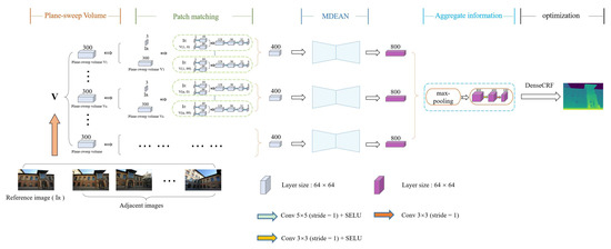 We first use COLMAP to perform sparse reconstruction using the set of input images to compute the poses of the cameras and the camera calibration parameters. Next, the plane-sweep volume for each adjacent image is computed. Then, all the plane-sweep volumes of all adjacent images are input to the proposed MDEAN.