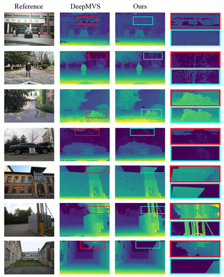 Qualitative comparison with DeepMVS. From the first, fourth, fifth and seventh rows, it can be seen that DeepMVS made many incorrect estimations on the wall and the sky, and the results of our method are visually better. The estimation for detailed structure is shown in the second row, the third row and the sixth row, where our method can accurately show the shapes of the branches, the bicycle and the metal rod, while DeepMVS cannot.