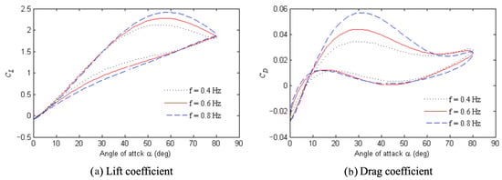 Example of longitudinal oscillations: (a) lift coefficients for 0.4, 0.6, and 0.8 Hz; and (b) Drag coefficients for 0.4, 0.6, and 0.8 Hz.