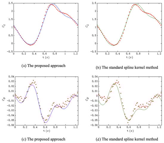 When the test data are not sufficient, the data-driven models including step response model and neural networks cannot be identified. We compared the proposed identification approach with the standard spline kernel-based method. We chose the experimental condition with frequency of 0.8 Hz. The estimation results are shown in Figure 3. In terms of the lift coefficient with slow time-varying characteristics, the proposed approach and the standard spline kernel method demonstrate almost the same tracking ability. The improvement is not obvious because of the locally linear features in the curve. In terms of the drag coefficient, which contains more complex nonlinear characteristics, the performance of the proposed method is obviously better. Given the same amount of training data, more features are caught by the proposed approach. The comparison results of objective function with the form of Equation (3) is given in Table 2, which proves that the proposed algorithm can track the hysteresis with a higher accuracy. As discussed above, in addition to the accuracy, the construction of Equation (3) also takes into account of the generalization ability of the model. Therefore, the proposed method has better generalization ability and is less sensitive to the noises in observations.