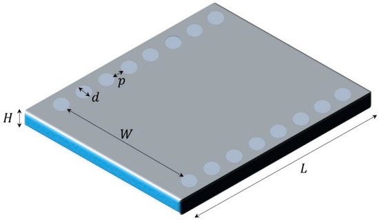 where the effective parameters are assumed (these are air-filled rectangular waveguide width , length , thickness , and dielectric permittivity effectively reduced to a dielectric-filled SIW). Additionally, two conditions are required for the distance between the centers of the vias (pitch) and their diameter to allow wave propagation (higher dimensions result in high power leakage) [17]: