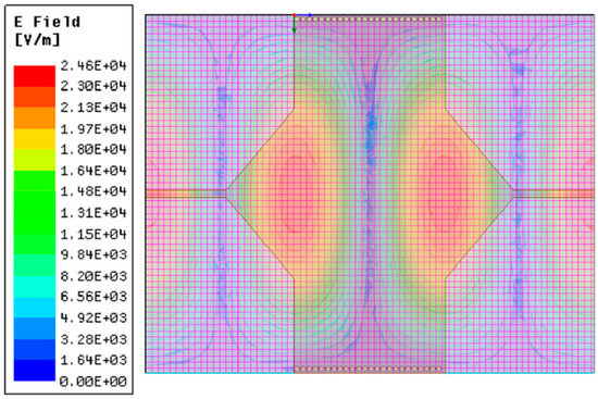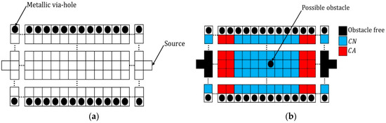 In Figure 3b, a third kind of cell is highlighted in black as obstacle-free regions; this is due to the high impedance so close to the source, and that may easily forbid propagation. The role of the obstacles is to act as resonators that couple the energy of only the selected frequencies. A frequency sweep between is then realized after modeling the empty SIW in Ansys HFSS; afterwards, the electric-mode peak frequencies are identified. Frequencies for the neighbor modes of are then used as solving frequencies in the simulator. The electric fields inside the SIW are then exported, discretized, and classified as and . Assuming that is the immediate-neighbor higher mode and the immediate-neighbor lower mode for TE, common cells are compared to obtain cells that might include obstacle