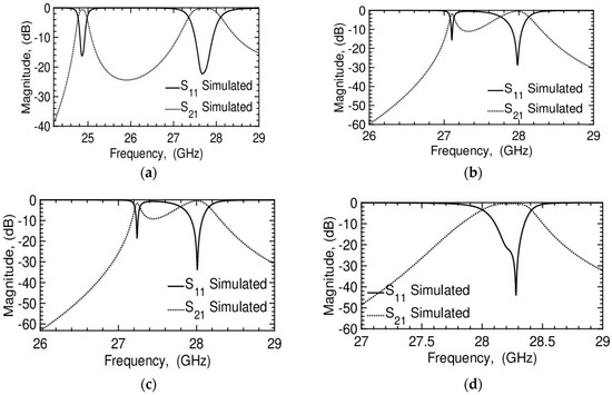 Increasing obstacles for simulated 28 GHz band Rogers 5880 filter: (a) one, (b) three, (c) five, and (d) seven obstacle(s).