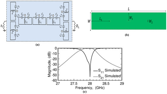 Simulated 28 GHz band Rogers 5880 filter. (a) Equivalent circuit for 28 GHz filter. Each via corresponds to an LC four-terminal element. and , equivalent resistance of source and load. (b) Schematic of proposed filter: mm, mm, mm, mm, and mm. (c) Simulated S-parameters.