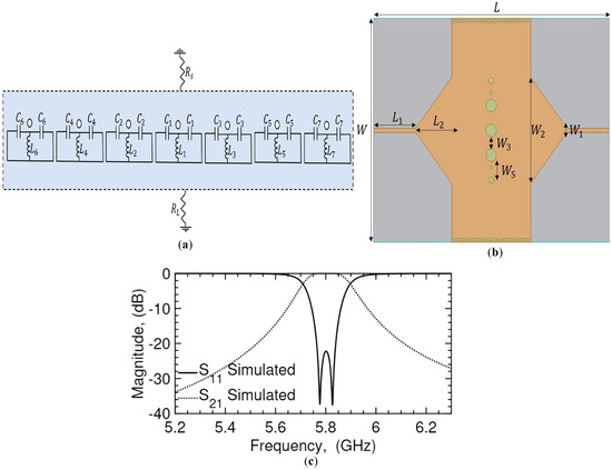 Simulated 5.8 GHz band silicon filter. (a) Equivalent circuit for 5.8 GHz filter. Each via corresponded to LC four-terminal element. and are equivalent resistance of source and load. (b) Schematic of proposed filter: mm, mm, mm, mm, mm, L = 24.6 mm, mm, and mm. (c) Simulated S-parameters.