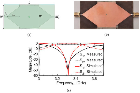 A low-frequency 3.2 GHz FR4 filter (having a copper layer of µm and a loss tangent of ) was used to prove the efficiency of a smart selection of the obstacle and its position in the waveguide using the presented methodology. Vias were designed to have a diameter of mm and a pitch of mm between each of them following the restrictions given by the used LPKF s103. The minimal number of obstacles to be used was selected to show the effectiveness of the methodology after fabrication; a straightforward center-inductive post was optimized using an EM simulator to filter the lower order and higher orders. The dimensions of the tapered transition and the SIW waveguide were optimized to avoid parasitic modes in the band of interest, reducing design complexity (Figure 9a). After PCB fabrication, a silver paste was used to fill the holes. A polishing process was completed to give a smooth and homogeneous finish (Figure 9b). The simulated and measured results of the filter are reported in Figure 9c. Vector network analyzer Agilent N5225A, calibrated using a through-open-short-match (TOSM) method with an output power level of −10 dBm was used for the measurements. The filter exhibited a measured insertion loss of 2.2 dB (compared to 0.2 dB from the simulation) and an peak of 57.97 dB (compared to 59.42 dB from the simulation). The −10 dB return loss bandwidth was measured to be between 3.17 GHz and 3.515 GHz, wider in comparison to the simulated bandwidth 3.223–3.402 GHz.