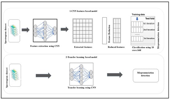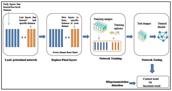 Speech is the semantic element of human communication through which human convey their message to each other. Therefore, in the last decade, Computer-Aided Language Learning (CALL) has received considerable attention due to its adaptability, which enables students at their own pace to improve their language abilities. Computer-Aided Pronunciation Training (CAPT) is a more precise sub-region of CALL, which emphasis on areas such as automatic pointing errors in non-native learners’ speech. CALL accomplished many tasks, such as pronunciation error detection, speech recognition, and pronunciation scoring. Moreover, much research has been done to apply speech processing techniques to different languages [,,]. For a specific language, speakers of different languages tend to form a distinctive muscle of the mouth. Sometimes our muscles may not be able to speak a non-native language because they create pronunciation errors in their utterances. There is no clear meaning of right or wrong pronunciation because it is a challenging task to measure the word “correct pronunciation”. Similarly, the variation that produced in accent is recognized and measured, either it is correct or otherwise, through a speaker’s prior knowledge about the people having a different accent. For perceiving and exploring foreign accents of speakers, authors in [] performed many linguistic experiments. There are many reasons for the mispronunciation of a speaker, such as a change in the mother tongue and accent. Consequently, pronunciation mistakes are categorized into prosodic and phonemic errors []. Phonemic errors exist due to phones that can differentiate one word from another and create a difference in the meaning of speech. In this case, speakers mostly interchange the complete phonemes with another similar phoneme that creates a difference in sound. On the other side, prosodic error exists due to phonemic variations. The prosodic error includes errors based on annotation, rhythm, and stress. Usually, researchers used acoustic-phonetic features to detect mispronunciation. Many researchers have investigated to detect mispronunciation for different languages (English, Mandarin, Japanese, and Dutch), but little work is done in Arabic. Researchers have used different techniques to detect mispronunciation. These techniques include posterior probability-based methods classifier-based methods, and deep learning-based methods. Mostly authors worked on some confusing phonemes of the Arabic language, but still little work is done on Arabic words.
