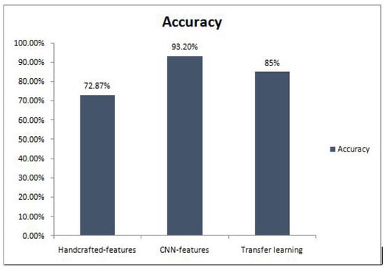 In our proposed features-based model, we extracted the features from different layers, i.e., layer 6, layer 7, and layer 8 of Alex net. Table 3 shows the results which are achieved on individual words by three different classifiers SVM, RF, and KNN by using the features’ set of fully connected layer, i.e., FC6. The features extracted from the FC6 layer have 4096 dimensions. The performance of the selected classifiers was evaluated on the FC6 layer, where SVM achieved the best results.