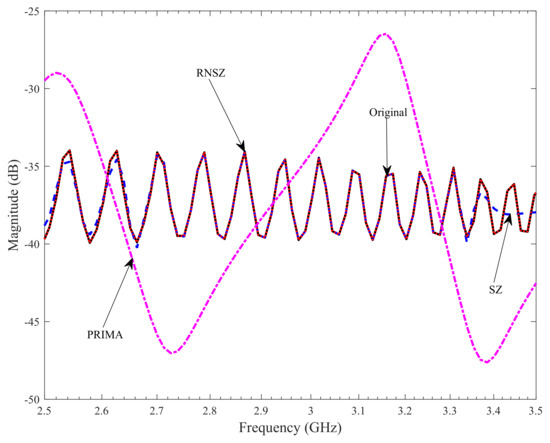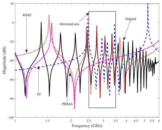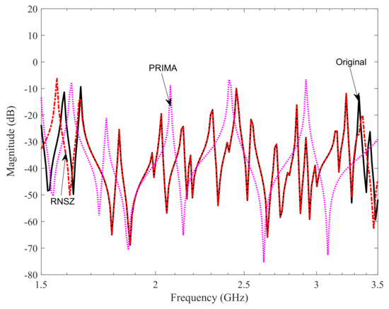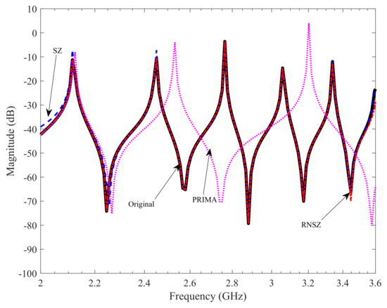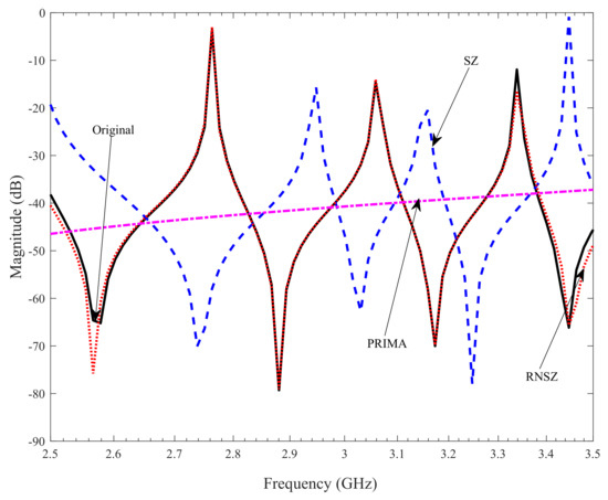 Firstly, we took the example of a low order 79 RLC network and compared the reduce order modeling result of PRIMA [19] and interpolation via SZ [37] with RNSZ method. The original system of RLC network is plotted in Figure 2. The comparison results in Figure 3 and Figure 4 (projection showing selected frequency of interest from 2.5 GHz to 3.5 GHz) shows a close match of RNSZ, with an overlapping peaks and response compared to the original system. However, a significant deviation is observed in case of SZ method using interpolation at selected spectral zeros and PRIMA. A comparison of the absolute error in dB is plotted in Figure 5. The error plot shows that our proposed method of RNSZ method has considerably reduce error relative to the PRIMA and interpolation via SZ.
