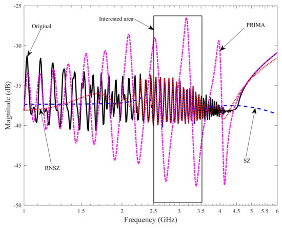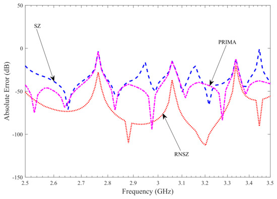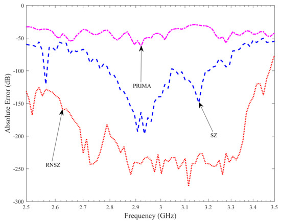 The absolute error plot shows minimum error for the RNSZ method. The calculated mean absolute error for the RLC network in the frequency of interest (2.5 GHz to 3.5 GHz) is −71.64 dB, −35.89 dB and −44.85 dB for RNSZ, SZ and PRIMA methods respectively.