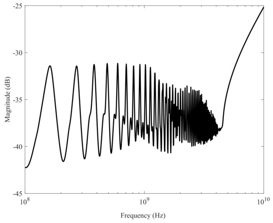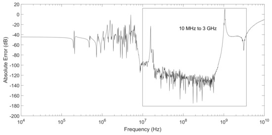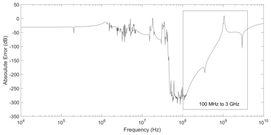 Absolute error of ROM generated using RNSZ of order N = 50 compared to original system frequency response of a spiral inductor (order n = 191). The mean absolute error is −100.97 dB from 10 MHz to 3 GHz frequencies.