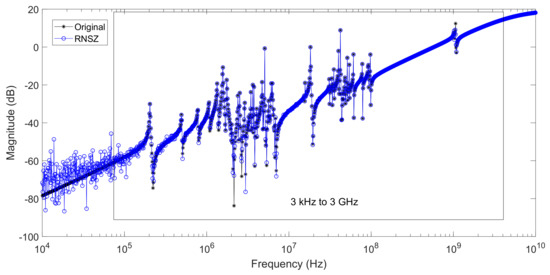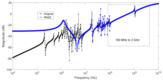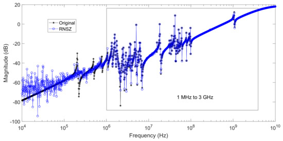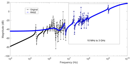 In order to gain good inside of the problem related with large band of frequencies, the next two examples are spread over a large span of frequencies, i.e., 1 MHz to 3 GHz and 3 kHz to 3 GHz. In third example we selected lower and upper range of frequencies to be 1 MHz and 3 GHz respectively. The simulation results are plotted in Figure 17 with a reduce order of n = 180 matching the original frequency response. It is worth mentioning here that ROM order in this case is quite high, almost comparable to the order of the original system. Therefore, the example highlights that the proposed RNSZ techniques is not suitable for large span of frequencies. The absolute error plot in Figure 18 shows a good match with a mean absolute error of −73.98 dB in the selected range of frequencies. The fourth and last example is for a frequency range of 3 kHz to 3 GHz. The simulation results are plotted in Figure 19 and again a very high reduce order of n = 186 is required to match the original frequency response. The absolute error plot in Figure 18 shows a good match with a mean absolute error of −76.29 dB in the selected range of frequencies.
