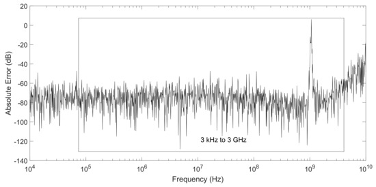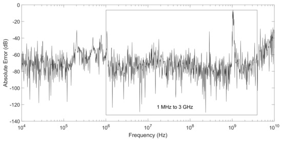 Absolute error of ROM generated using RNSZ of order N = 180 compared to original system frequency response of a spiral inductor (order n = 191). The mean absolute error is −73.98 dB from 1 MHz to 3 GHz frequencies.