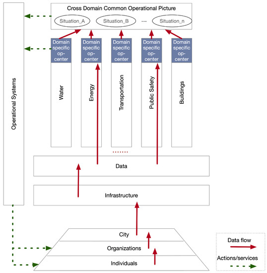 Figure 1 proposes a conceptual view of the SCSS framework, which is obtained by extending the model of the smart city proposed in [11], relied on the principles of the SDL and service science and consisting of the three foundational concepts aforementioned. At the basis of the model, we have the individuals that work and live together in families, communities, enterprises, which are labeled as organizations. Individuals and organizations belong to the city and act in it, producing data, offering, and consuming services. The city is also composed of (limited) resources that allow vital services to be offered to the citizens. IBM [11], as well as other authors, identify these as city domains. Specifically, each city should have at least five domains: Water, energy, transportation, public safety, and buildings. Each of these domains has its rules, its operations, its services and poses different challenges. According to this, each domain has its own operational systems that allow for performing the required peculiar operations (e.g., water distribution, bus lines scheduling, etc.). At the top of each domain, there is a control and operation center, specific to that domain, in which the resources are controlled, the operations are managed, the services are configured and monitored, and the decisions are made. However, to achieve a comprehensive view of the city, as foreseen by the SCSS framework, the different domains and operational and decisional systems should be interconnected and integrated. This interconnection can be realized at the managerial level thanks to the integration and correlation of the data produced in each specific domain. At the top of the domain-specific control center, there is a cross-domain operation center. Here the integrated information is analyzed to provide a common operational picture that represents the current situation of the city. Such a situation can be identified by means of inference and classification processes applied to all data coming from the domain-specific control center. It is the capability to integrate heterogeneous data and to show only the relevant information that adds value to the decision-making process. This allows the governors, policymakers, and decision-makers to identify trends that can help predict future situations and to make coherent and informed decisions for improving the smart city, thus offering new services and realizing innovative projects. Such activities need to be sustained by an integrated view of the available data. Let us underline that the individuals share their data with the city via the organizations in which they act. This level of indirection allows to further anonymize the data shared with the city. Indeed, the organizations may decide to share only aggregated data with the city. Another important aspect is that part of the data of the organization could be already public or generally available to everyone, and therefore no new privacy issues emerge in those cases. For instance, if we consider the case of a university as an organization, there are data regarding the individuals (professors, students, staff) that are already public: Information on exams and the number of participants; date and participants to board meeting, etc. Such information can be easily shared with the city, without harming the privacy of the individuals, but with enormous advantages from the perspective of improved services for the university and the city. Another example of organizations can be restaurants or cinemas. Such organizations do not have to share information on their customers, but only aggregated information, as the number of current customers or potential reservations. This could help the city in tailoring some public services, like the optimization of public transport or energy management.