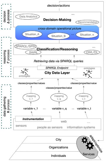 - : Each variable is mapped to a specific concept of the ontological model. A mapping function is used to map each variable to one of the classes, properties or values of the ontological model. The obtained semantic data are stored in the city data layer.