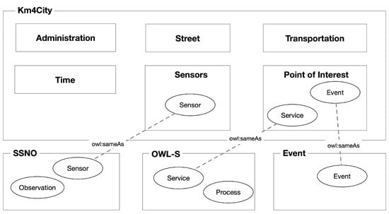 A high-level, conceptual view showing the main modules of the ontological model with their alignment is depicted in Figure 3. The Km4City ontology consists of six modules: Administration includes classes related to the public administrations; Street represents the road system of the city; Transportation includes classes related to the local public transport like buses, companies, time schedules; Time represents the temporal aspects of events and services extending the OWL-Time ontology; Sensor represents data gathered by sensors like pollution, weather, and traffic; and Point of Interest includes all services, activities, and elements of the city (like monuments and buildings), useful for citizens [38]. The SSNO ontology was integrated for representing sensing devices and observations. Although Km4City has a module representing sensors, we decided to import SSNO because this scheme is much more detailed, allowing us to describe a sensing device in detail (together with the platform and deployment information) with information regarding the observations and the measurement procedures. The ontological model also includes the OWL-S [36] ontology to describe services in terms of their interface (e.g., input, output, and conditions), the process implementing the services, and the implementation details. Lastly, we aligned the module point of interest of Km4City with the EventOntology. This ontology enables the description of events (e.g., concerts, sports events, and exhibitions) hosted in the city. It adds temporal information to the events, which instead is missing in the point of interest module of the Km4City ontology.