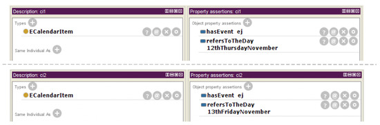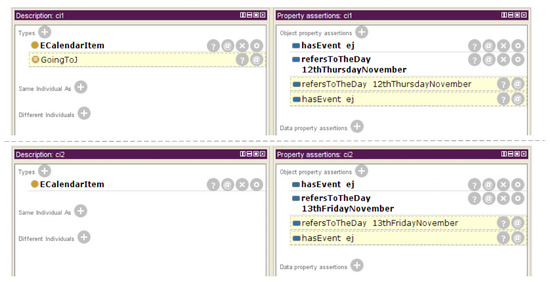 Let , be two individuals of the ECalendarItem, as depicted in Figure 6 defined using Protégé (https://protege.stanford.edu/). Both items are linked to the event but in different days: on 12 November, and on 13 November. Only 12 November is an individual of the DayOfInterest class. The result of the reasoning process is depicted in Figure 7. Only c1 is correctly classified as an individual of GoingToJ class.