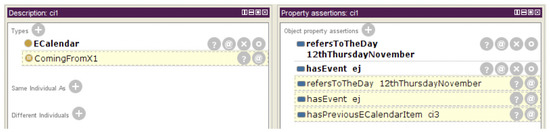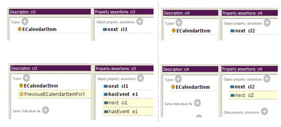 Continuing with the previous illustrative example, we consider other two e-calendar items, and . The item comes next to the item , while next to , as depicted in Figure 8. After the reasoning process, only the item is classified as an individual of PreviousECalendarItemForJ, according to Equation (2), since it comes before an item that has been classified as an individual of GoingToJ.