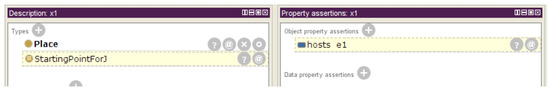 Considering again the previous example. We add an event to the individual . The event takes place in the location , specified with the property schema:location. According to the restriction of Equation (3), the location is classified as StartingPointForJ (as depicted in Figure 9), since the item is the previous item of the , which was classified as GoingToJ.