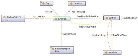 In , for each starting point , the best routes to the destination Y both by car and by LPT are identified and the fastest route is identified. If it is by car, a message is sent to the officer to let him know about the lack of public service related to that route. Each local public transportation path is represented as an individual of the LPTPath class that we have defined in the ontological model depicted in Figure 12. A path is available for a specific day and in a specific time slot. Moreover, a path is made of different sections that connect two points/stops (e.g., two bus stops). In this way, it is possible to know which sections are more crowded, for which stops are needed more transportation means, and so on.