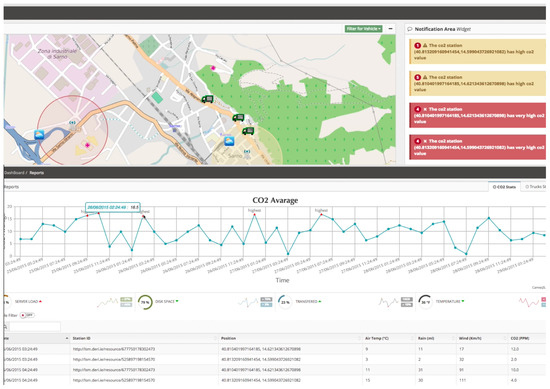 The SAGAT methodology requires that the participants use a system in order to effectively measure the SA in a real environment. In each trial with the system, the participant has a goal to achieve by completing a given task. For this experiment, we designed and implemented a prototypical system based on the Smart City Service System framework. It is a Decision Support System (DSS), used by logistic managers to monitor and control a fleet of goods transport vehicles. The dashboard of the DSS is depicted in Figure 13. The DSS gathers data from multiple sources like vehicles, drivers, traffic services, weather forecasting services, and the management information system. The aim is to support the logistic manager in reducing cost and environmental impact of the transportation. Further details on this system are in [48,49].