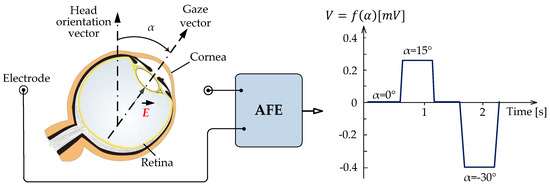 The biopotentials generated by the human body have given rise to numerous studies and to some applications. The biopotentials recorded by the movement of the eyes are called an electrooculogram. The origin of this recording goes back to the year 1848 when the German physicist Emil du Bois-Reymond observed for the first time in history that the front of the eyeball (the cornea) is electrically positive with respect to the back (the retina), thus concluding that the eye could be modeled as a dipole. The eye, by performing different movements within its orbital cavity, generates a measurable potential by means of conveniently arranged electrodes. This is the basis of electrooculography upon which the subsequent studies are based. Figure 1 represents in a simplified way the foundation of the EOG by modeling the eye as an electrode-measurable dipole [1].